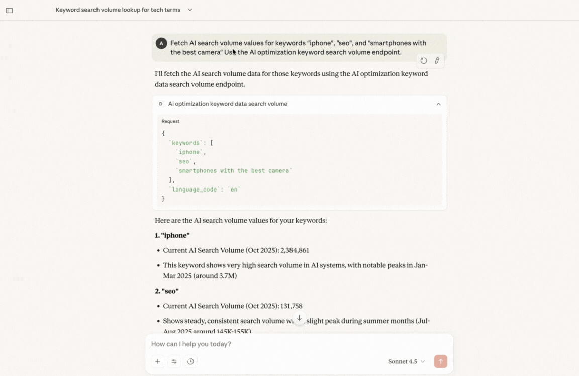 “Fetch AI search volume values for keywords “iphone”, “seo”, and “smartphones with the best camera” Use the AI optimization keyword search volume endpoint.”