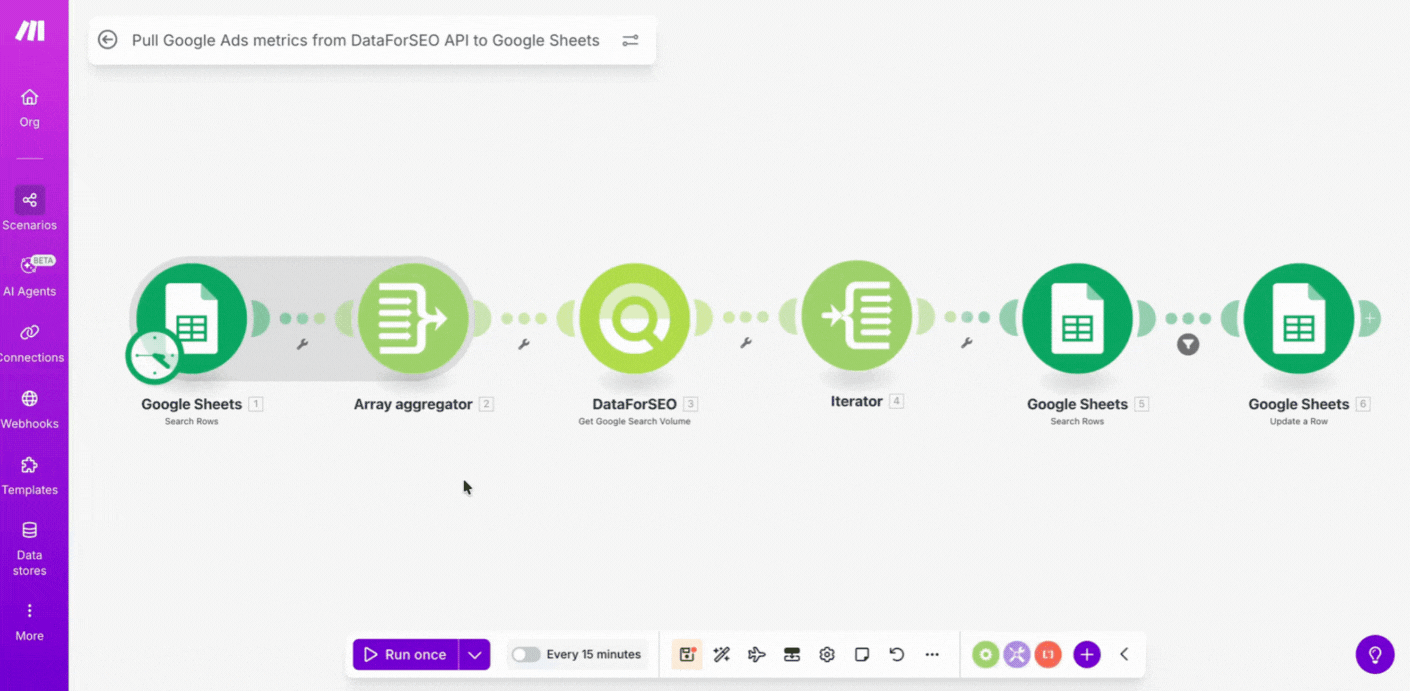 Besides, similar to SERP API endpoints, most keyword research-related endpoints can be used in no-code solutions that streamline day-to-day SEO tasks. For example, by using DataForSEO integration with the Make automation platform, you can build automated keyword analysis workflows, like the one below.