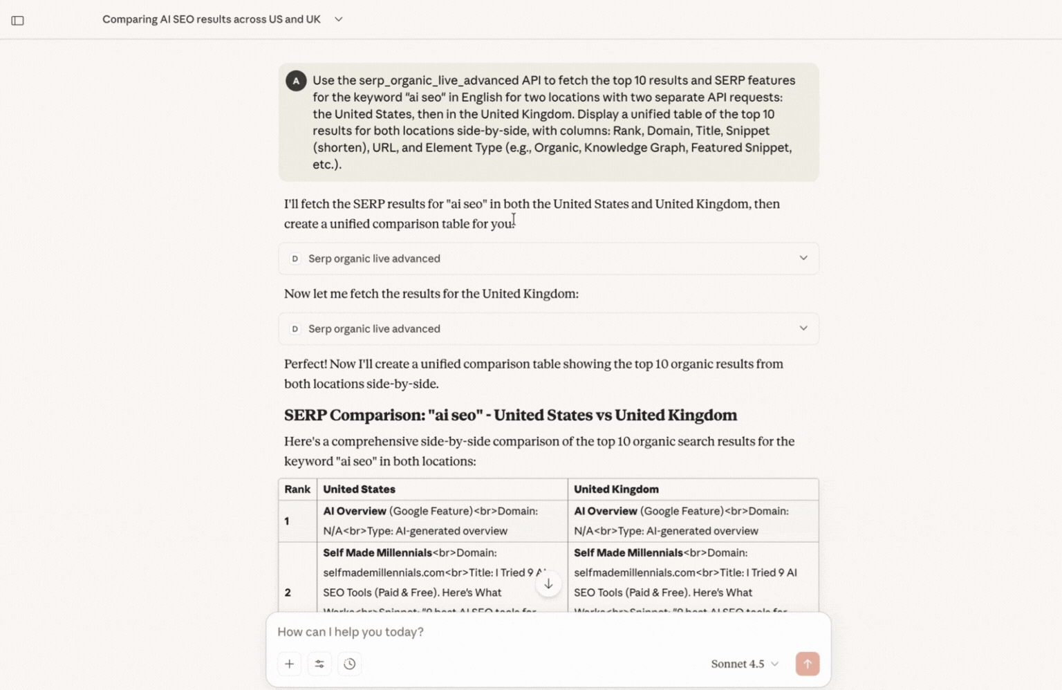Here is the result. As you can see, Claude made two requests to the Google Organic endpoint and fetched actual SERP data according to the prompt. After that, the LLM generated a side-by-side SERP comparison for two locations with all the necessary data.