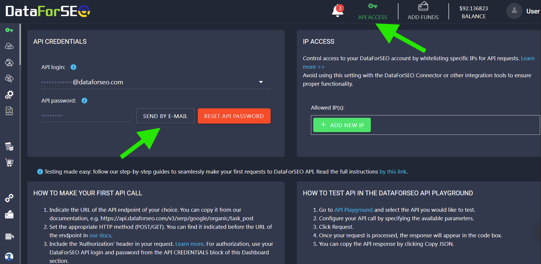 Create a free account at DataForSEO. Go to the API Access tab in the Dashboard, and copy your API login and password (visible for 24h) to create a connection in n8n and other platforms.