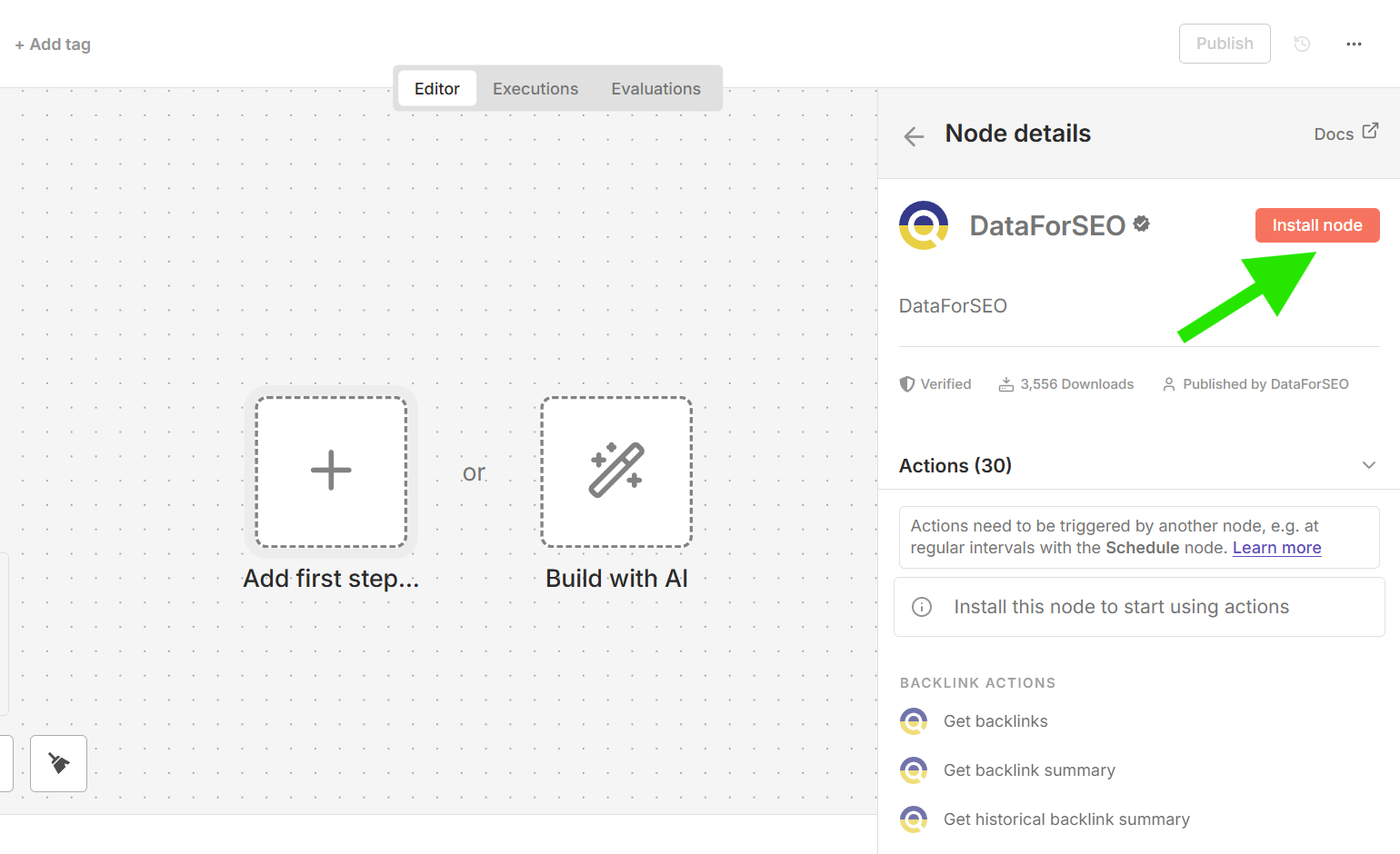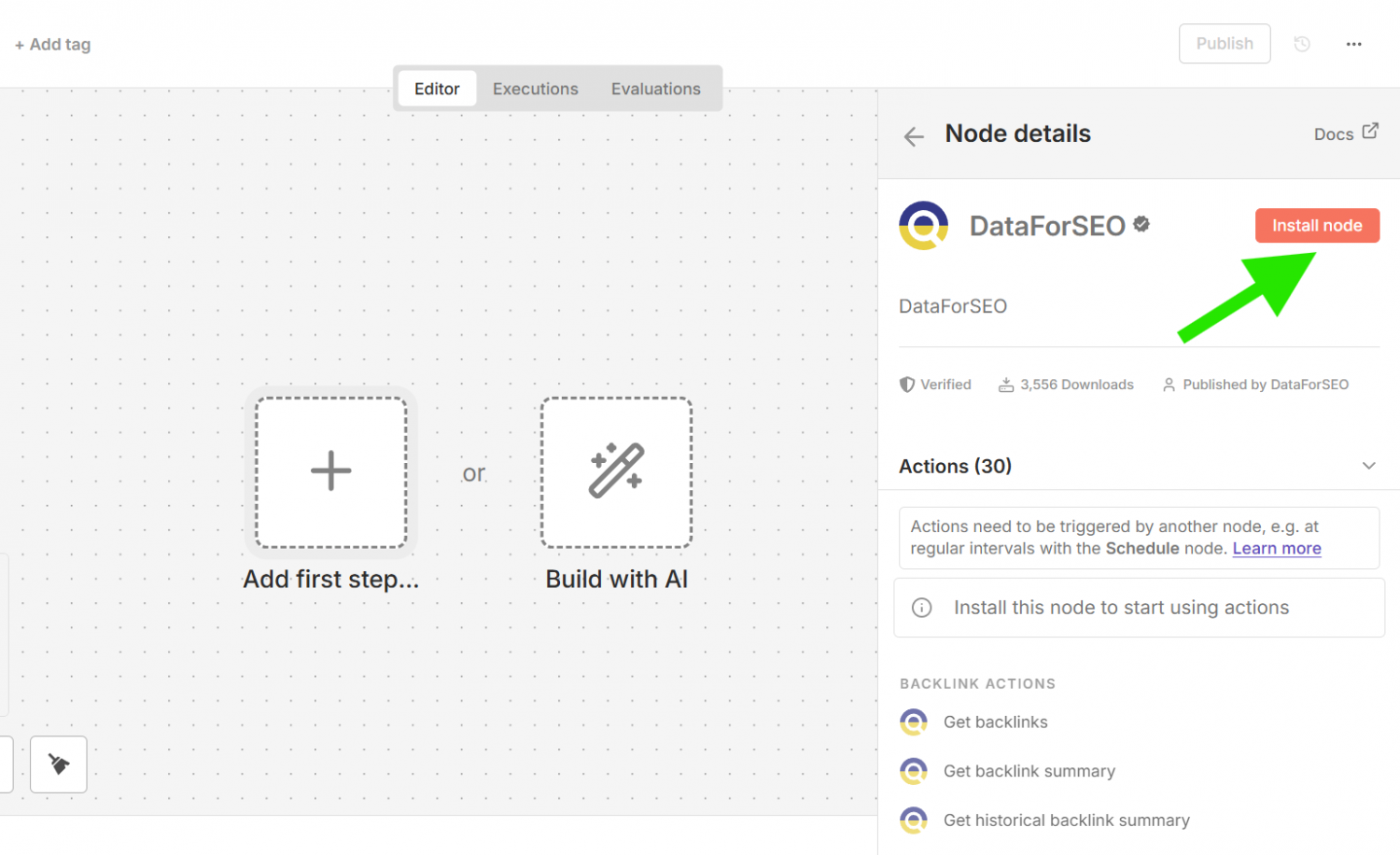 Use the search bar to find DataForSEO, then select the version with the badge, and click Install node.