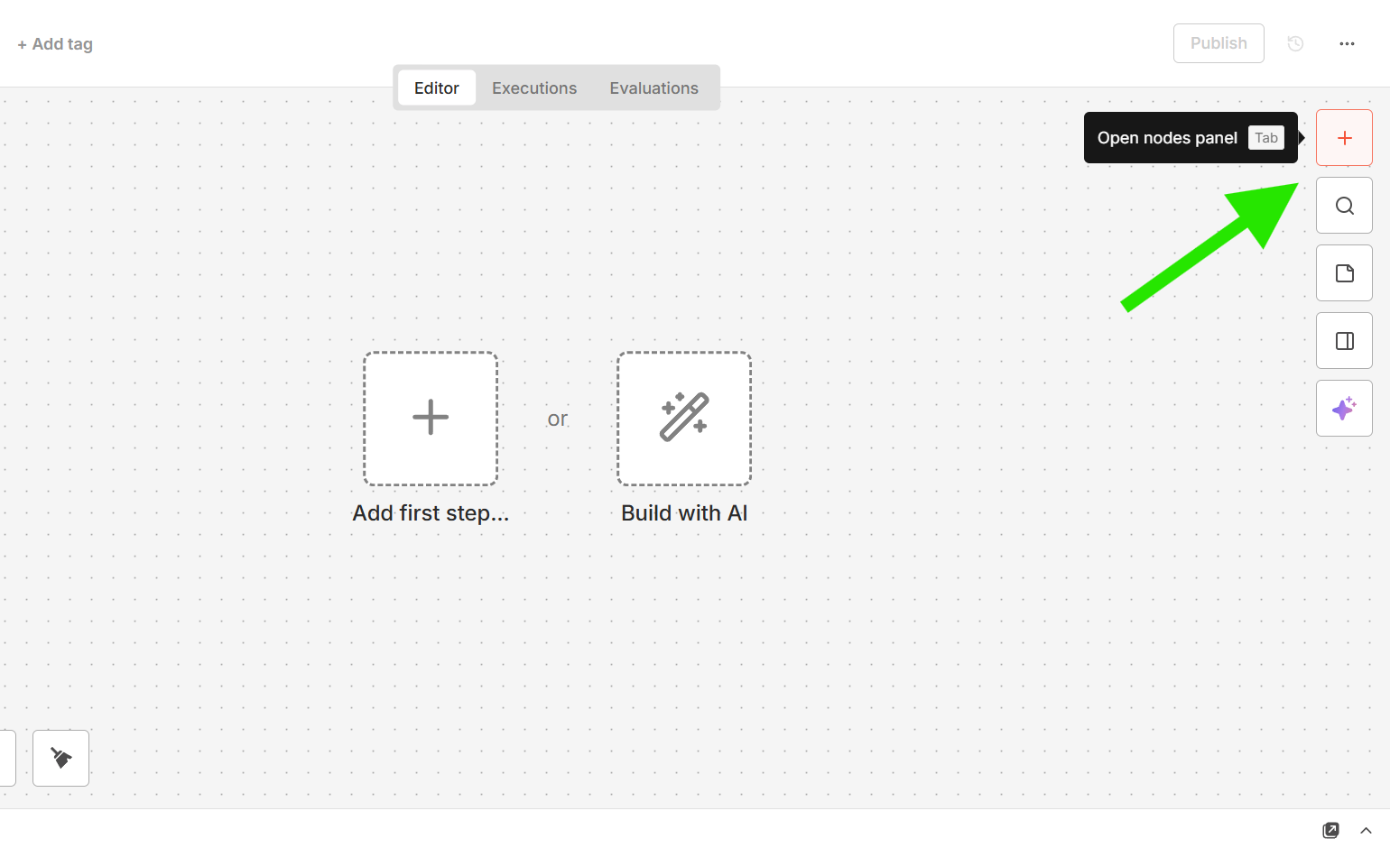 Sign in to your n8n account and go to the workflow editor. In the upper-right corner, click the + icon. This will open the Nodes panel.