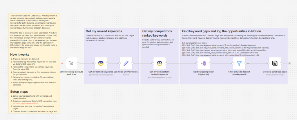 Automate the discovery of keyword gaps between your website and competitors. This n8n workflow uses the DataForSEO Ranked Keywords API to identify keywords where your competitors rank but you don’t, enriches those opportunities with search volume and related long-tail suggestions, and logs the results into Notion for analysis and content planning.