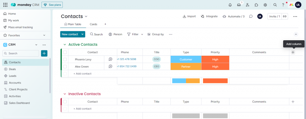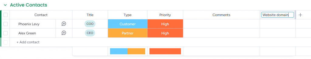 1. To create a field for entering the website domain, navigate to the Contacts board and click the + (plus) icon at the end of the table.