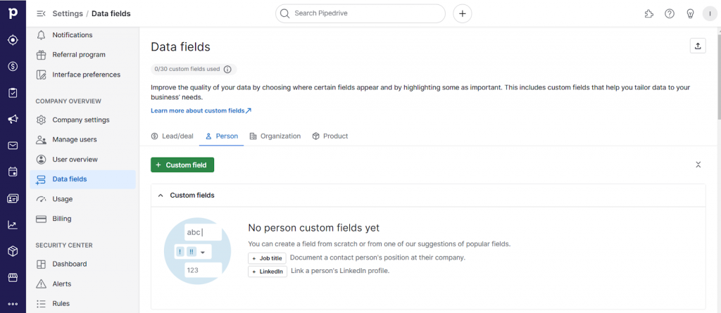 - Go to Settings > Data fields > Person and click + (plus) Custom field.