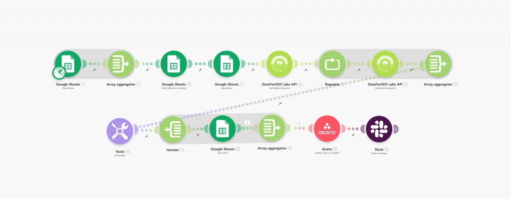 - A Make.com account with the DataForSEO, Google Sheets, Asana and Slack integrations connected.