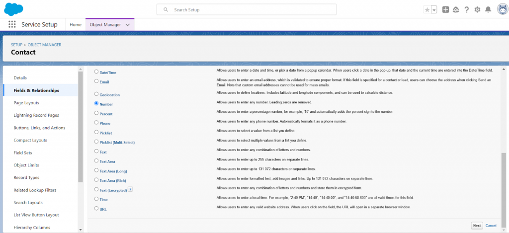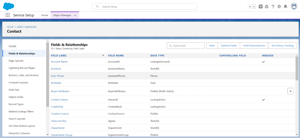 - Navigate to Object Manager > Contacts > Fields & Relationships.