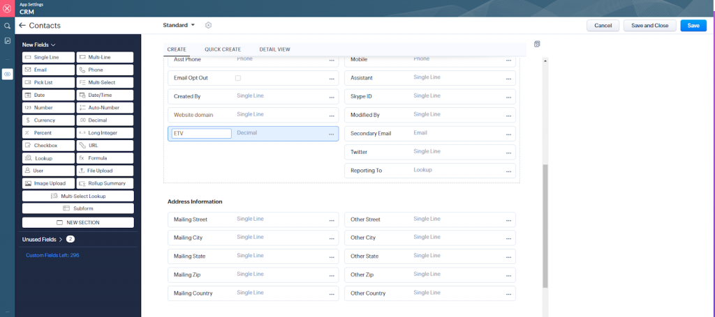 - Create a custom field for entering the website domain by dragging a Single line field from the New fields panel on the left into the desired section of the Contacts module, and give it an appropriate name.