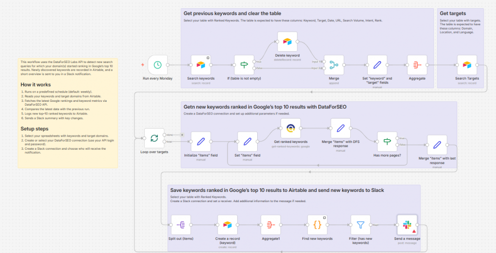 This workflow automatically tracks when new keywords enter Google’s top‑10 search results and logs them to Airtable, while also sending Slack notifications to keep your team up to date. By using the DataForSEO API, the scenario identifies fresh high‑ranking opportunities and keeps your Airtable database synchronized without manual tracking or data entry.
