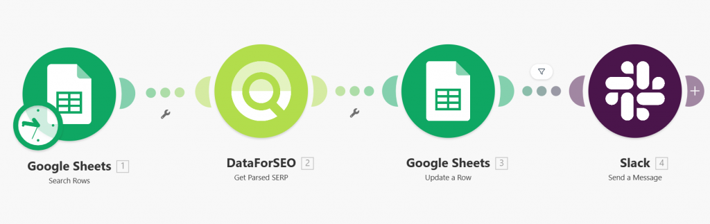 - The scenario runs on a schedule and checks keyword rankings using the DataForSEO API.