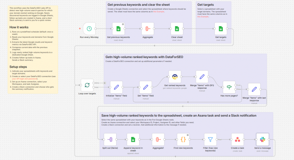 This workflow automates turning newly discovered high-volume ranked keywords into actionable tasks in Asana using the DataForSEO API. Instead of manually reviewing keyword lists and creating follow-up work, this automation identifies keywords with strong search potential and generates corresponding tasks in your Asana project for your team to act on.